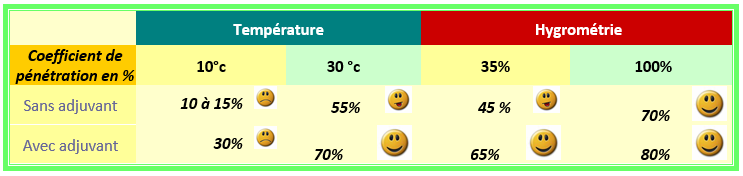 Il faut attendre les bonnes conditions pour intervenir, car l’évaluation des déperditions est maintenant bien connue : 30 à 70% des gouttelettes n’atteignent jamais la cible quand l’application a lieu avec du vent ou une faible hygrométrie. Pire, 100% des gouttes inférieures à 200µ dérivent avec un vent supérieur à 19 km/heure.