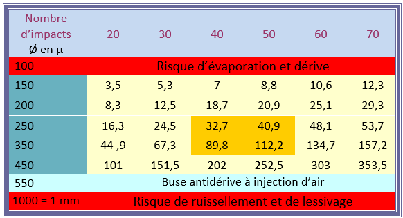 Volume de bouillie / ha selon le nombre d’impacts et leur taille :